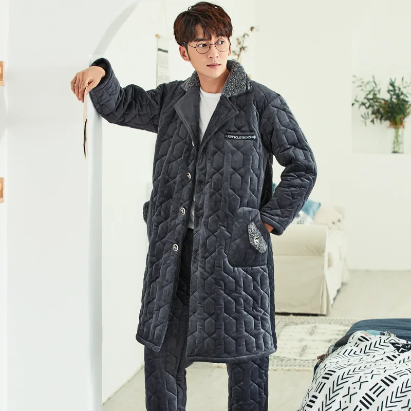 Pajamas Men's Autumn and Winter Coral Fleece Quilted Thickened Flannel Mid-length Warm Suit Pijama Invierno Hombre Dormir Tops